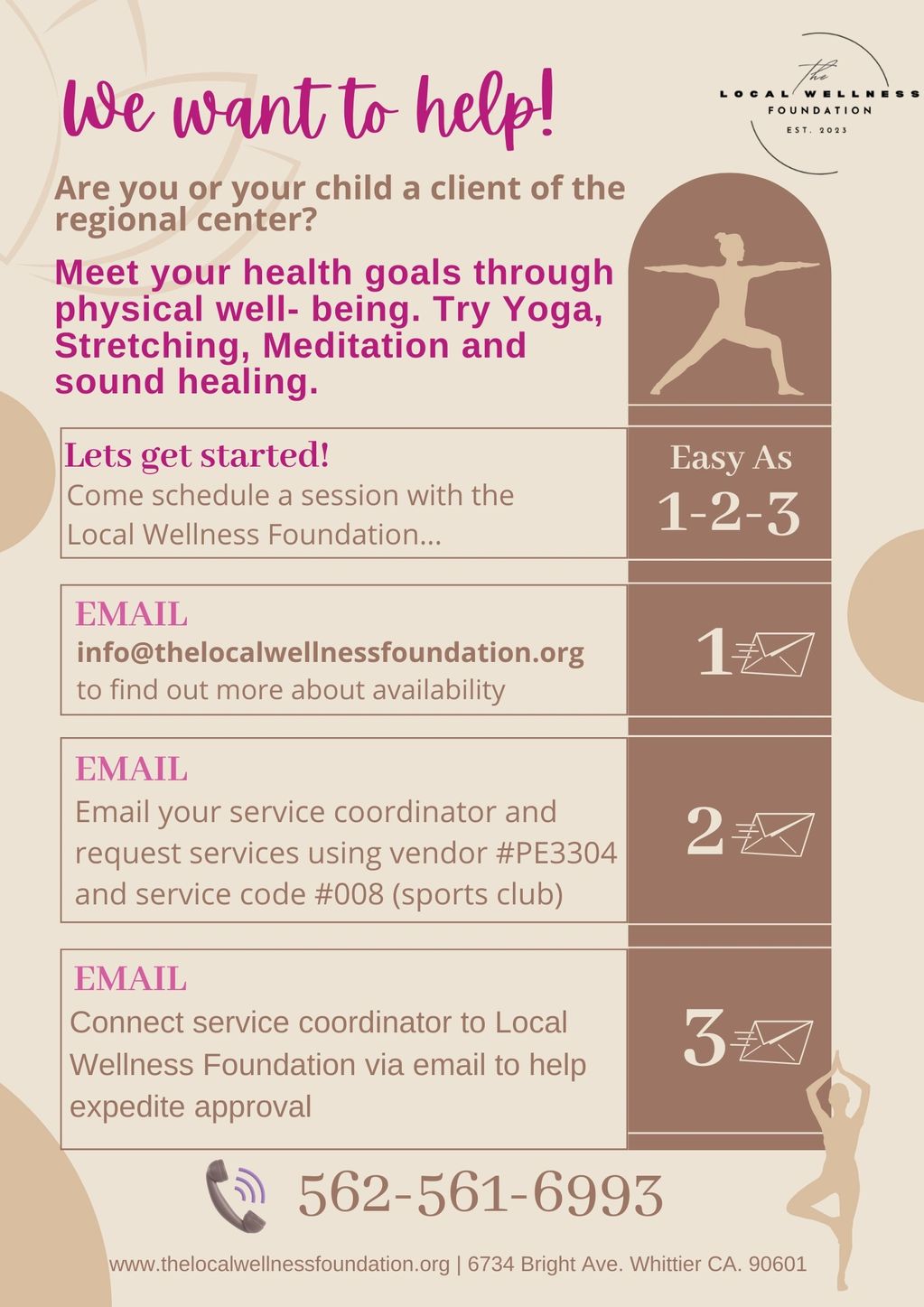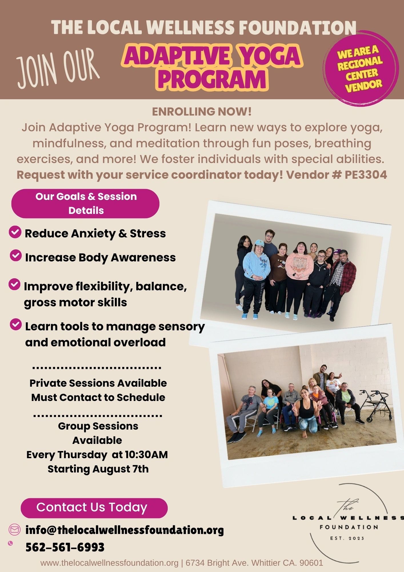 The Local Wellness Foundation proudly presents our Adaptive Yoga Program. This unique program blends yoga, creativity, mindfulness practices, and outdoor play, all while emphasizing healthy living and personal growth. This program is offered in one weekly group session and we are now taking new 1x1 clients too! Rates and Regional Center request information below.